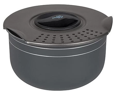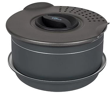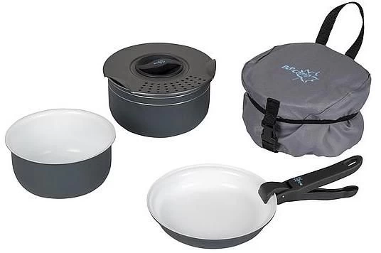 A stylish and very compact 5-piece pan set. This complete lightweight set consists of 2 saucepans, 1 frying pan, a straining lid and a pan handle. These pans have a powder coating on the outside and a ceramic coating on the inside. The ceramic is very durable and has a high quality non-stick coating. Suitable for the following heat sources; gas, ceramic and electric. All parts can be compactly stored in the supplied luxury protective cover.