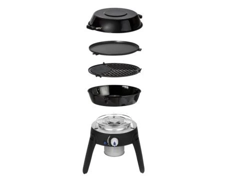 The Cadac Safari Chef HP operates off the CADAC 500g EN417 threaded gas cartridge (not included) or any other EN417 threaded gas cartridge which fits directly into the BBQ.