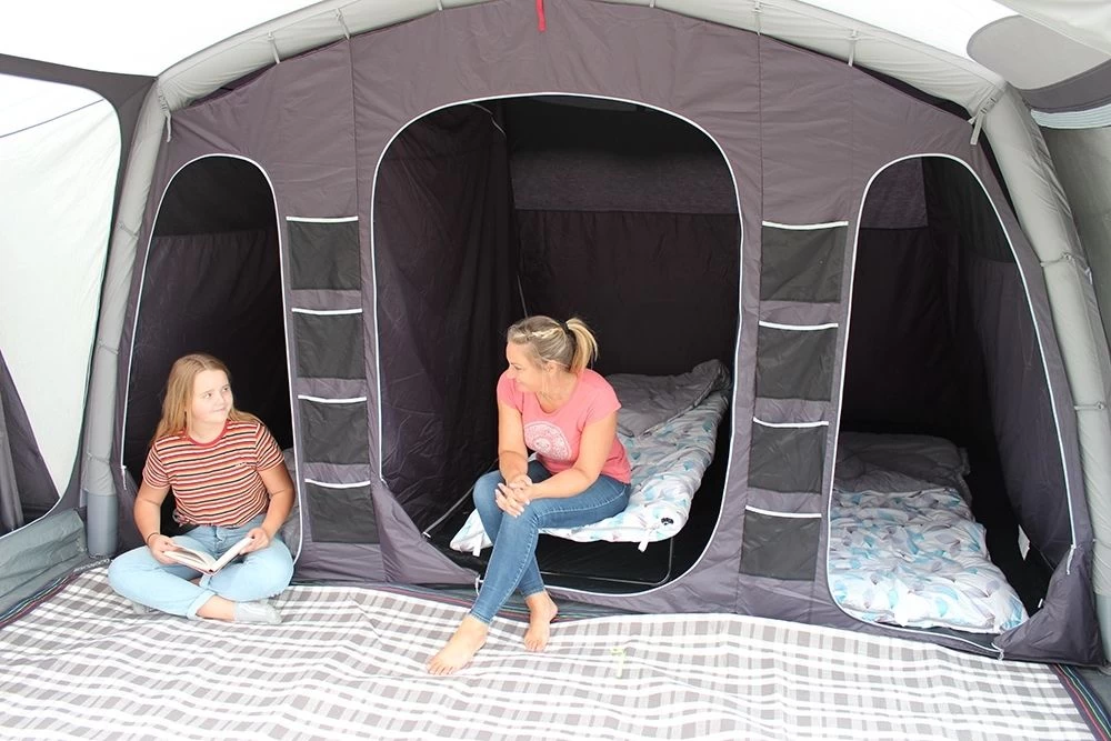 Each of the three bedrooms across the rear of the tunnel tent is separated by zipped dividers and comfortably accommodates two average adults, or a double air mattress, offering ample room for the whole family to enjoy.