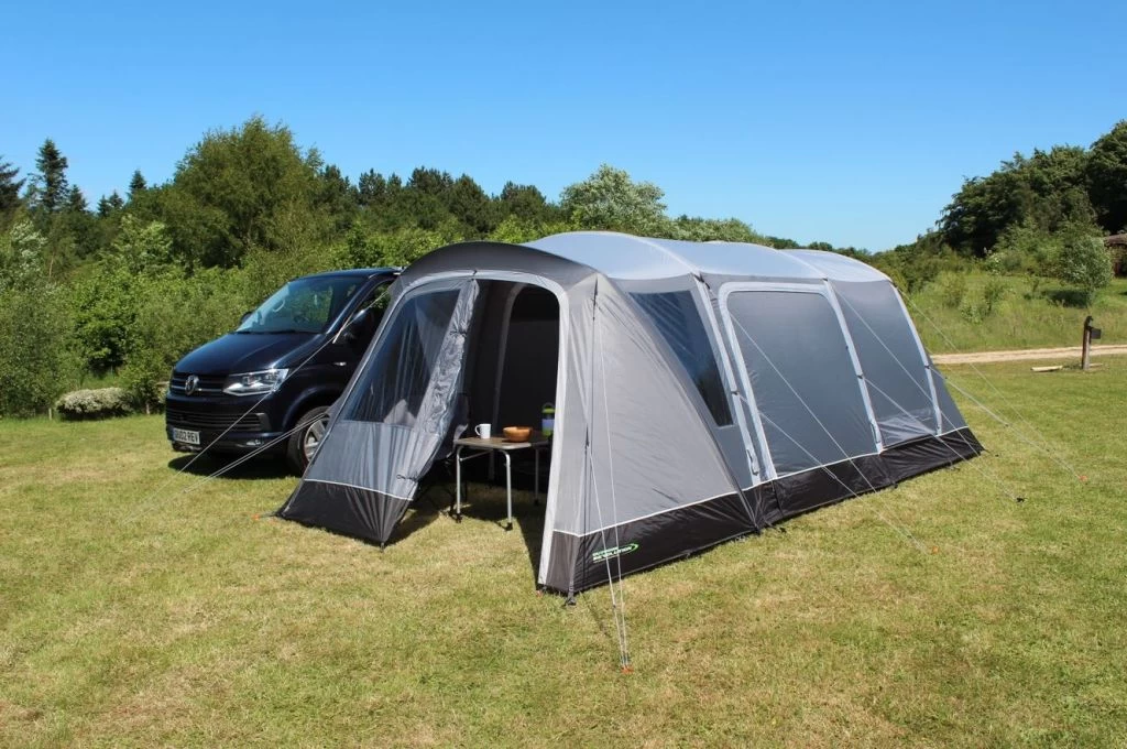 The Cayman Cacos Air SL is a large yet lightweight driveaway awning designed in the popular side-by-side style, meaning the front of the awning faces the same direction as the front of your vehicle. Pitched quickly using 3 inflatable air tubes and 1 fibreglass pole, uniquely the Cayman Cacos Air SL comes with an integral 4-berth inner bedroom making it a perfect choice for families. Available in 2 ergonomic cowl sizes to fit rail heights of up to 255cm, there is also the option to attach a Zip-On Porch Door which will fully enclose the front porch. This porch door creates a huge amount of additional living space, and also allows for the addition of a ‘Cabin Inner’ bedroom which will effectively allow for sleeping capacity for up to 6 people.