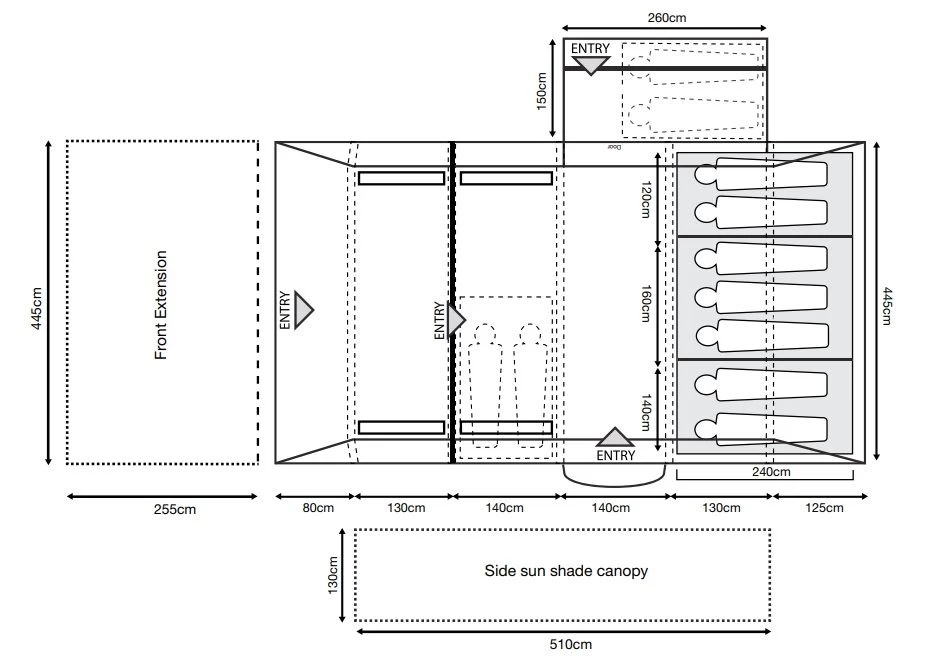 A maximum sleeping capacity of eleven can be reached should you choose to purchase a secondary optional two-berth inner tent. The parallel design of this porch area means that only a fraction of extra space is utilized at the side of the family tent.