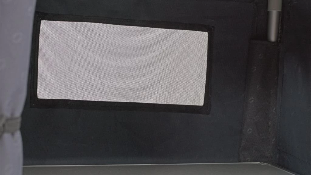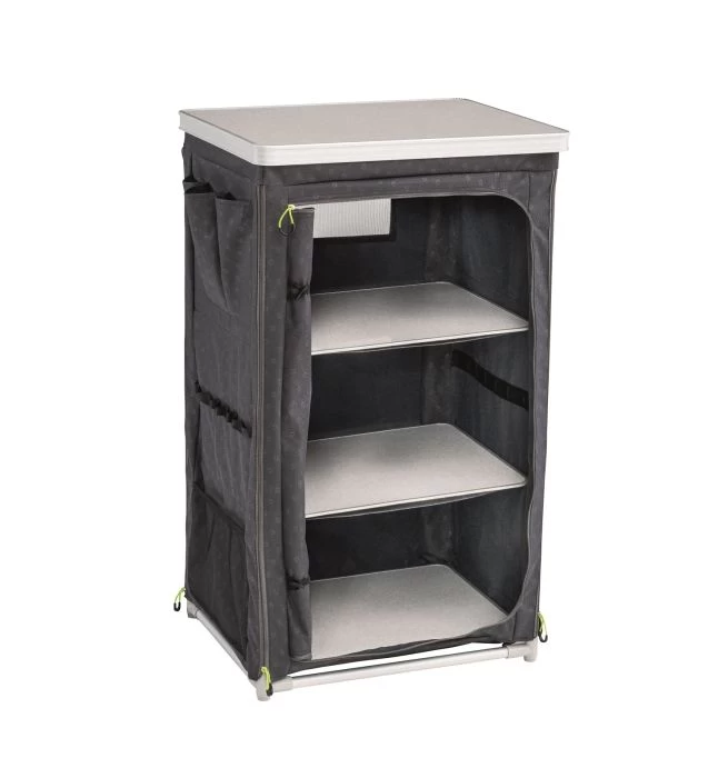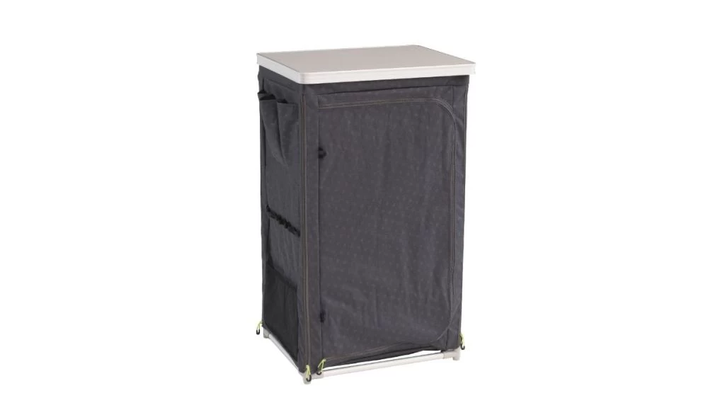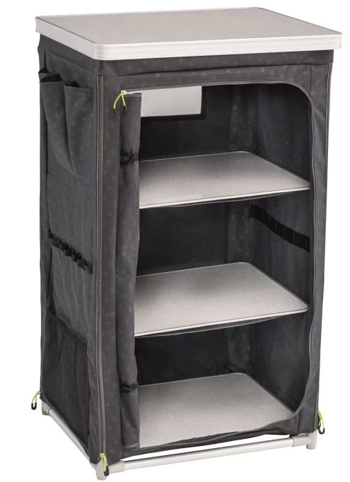 The Milos Cupboard from the Outwell Furniture Collection features three shelves with a zipped door keeping belongings out of sight. There are pockets and hanging points to add further storage for smaller items as such keys and phones.