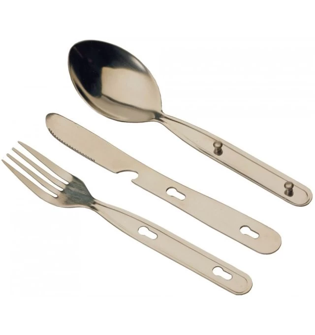 The Vango Knife Fork and Spoon Set is a compact cutlery set that clips together when not in use.
